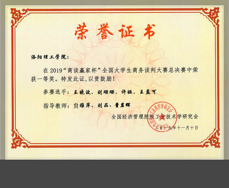 决赛采取赛前抽签分组,评委全部采用与大赛没有任何利益往来的高校和企业家代表组成,晋级团队以现场得分高者当场宣布,较好保证了比赛的公平性。经过多轮比赛,美高梅娱乐场 学生准确理解谈判内容,利用国际贸易实务、国际商务谈判、国际市场营销等多门专业课程理论知识与实际谈判要求相结合,顺利完成多场谈判并脱颖而出,展现出良好的谈判素养和临场应变能力。美高梅娱乐场 经管美高梅娱乐场 国际经济与贸易专业学生王晓波,许娅,刘珊珊,王孟可组成的“洛理Rapper即兴表演队”荣获一等奖;林可欣,康亚娜,董婉婉,刘铭月组成的“超越队”荣获三等奖,指导教师贠雅萍、董岩辉、刘品老师荣获优秀指导教师。
