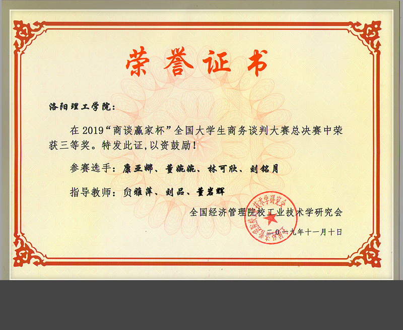 11月9日-10日, 2019年“商谈赢家杯”全国大学生商务谈判大赛总决赛在中北大学举办,经管美高梅娱乐场 国际经济与贸易专业学生分获一等奖和三等奖的优异成绩。