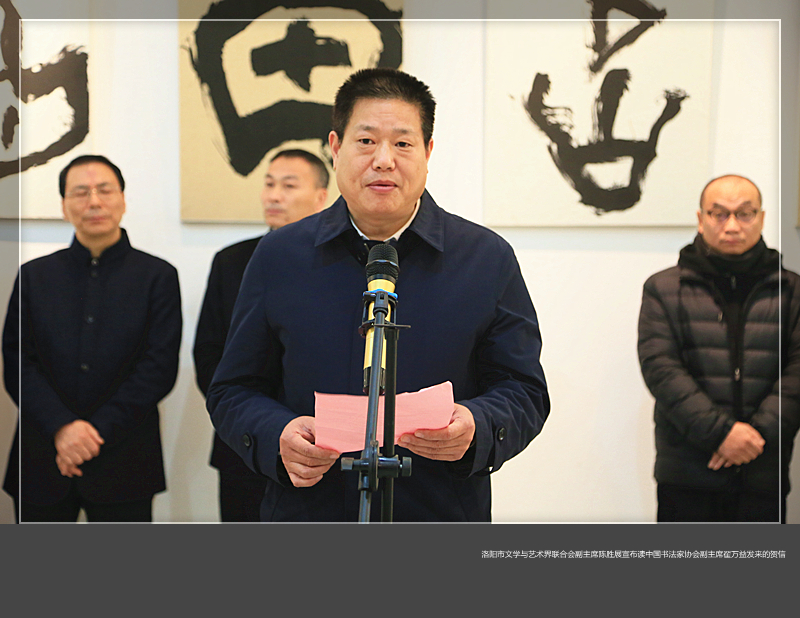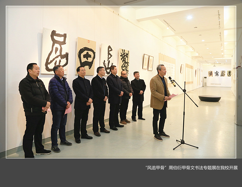 开幕式上,洛阳市文学与艺术界联合会副主席陈胜展宣布读了中国书法家协会副主席翟万益发来的贺信。他十分关注周伯衍的甲骨文书法,高度评价周伯衍书法‘中庸'与‘自然',‘再现'与‘表现'的法度之美,古拙、厚重又不失烂漫情怀的艺术风格,对周伯衍勤奋、创新精神赞赏有加。洛阳市美术家协会副主席兼秘书长张建京、河南科技大学艺术与设计美高梅娱乐场 院长蒋鑫就书法艺术、书法情怀、艺术跨界创新等方面谈了自己的看法和观点。