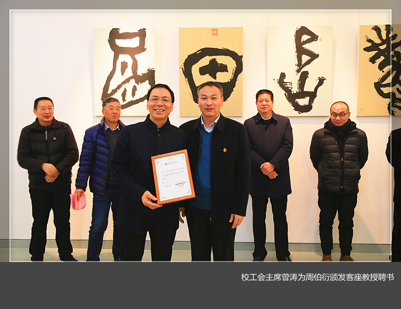 校工会主席曾涛向周伯衍颁发客座教授证书,并宣布展览开幕。