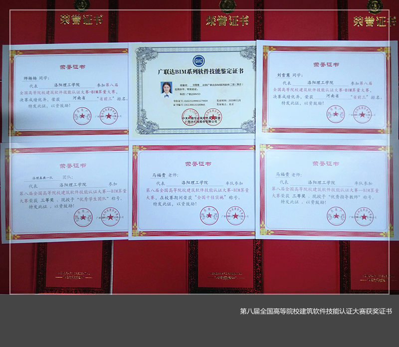 在第八届全国高等院校建筑软件技能认证大赛中,马福贵老师荣获全国十佳实施奖,学生团队荣获团体赛三等奖1个,个人赛三等奖2个。