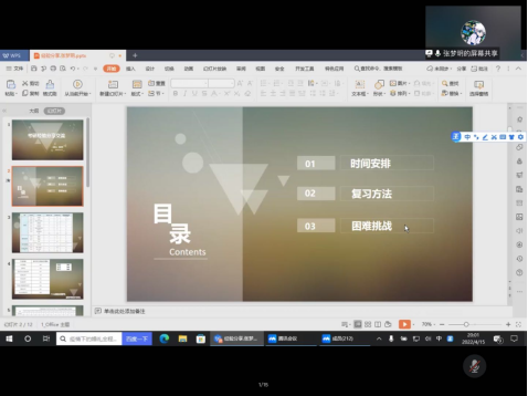 2022年4月15日晚在美高梅娱乐场 辅导员张瑞老师的主持下由张邱荥、张梦玥、卞惠玉、穆鹏程四位学长、学姐进行分享开展了考研经验经验分享会。