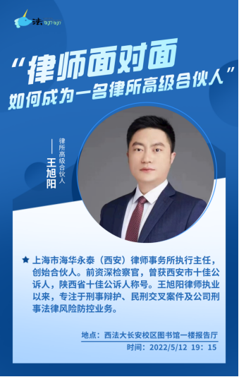 本周四晚7点15分,法叨叨特邀上海市海华永泰(西安)律师事务所高级合伙人为我们学子分享他从法律小白逆袭为律所合伙人的成长道路。