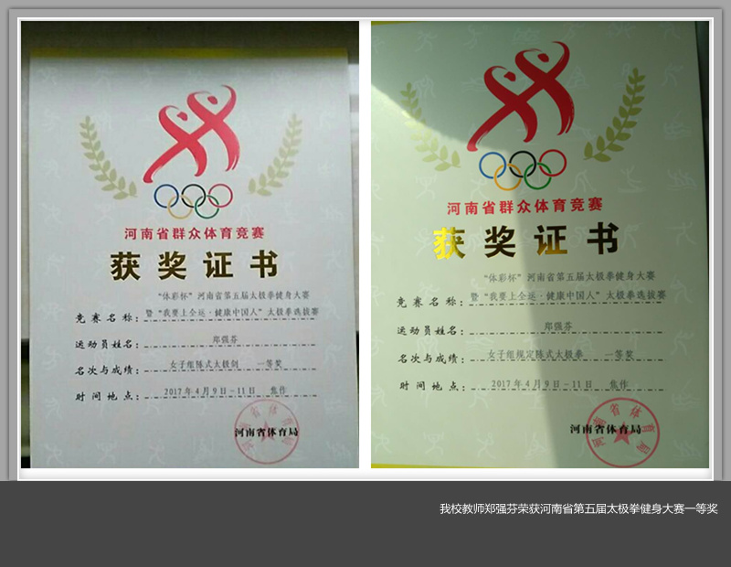 教师郑强芬荣获河南省第五届太极拳健身大赛一等奖