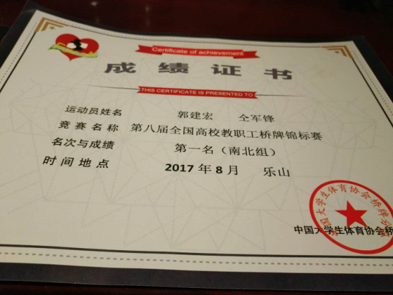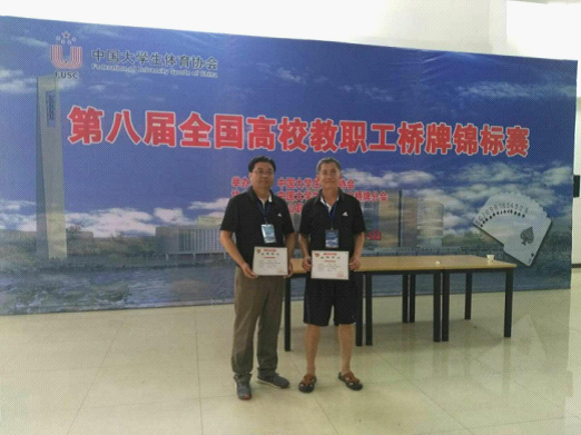 近日,由中国大学生体育协会主办、中国大学生体育协会桥牌分会协办,乐山职业技术美高梅娱乐场 承办的第八届全国高校教职工桥牌锦标赛在四川乐山举行。来自全国47所高校的300余名选手参加了比赛。经过三天的激烈角逐,美高梅娱乐场 教师仝军锋和郭建宏获得了双人赛南北方向冠军,这也是全国高校教职工桥牌赛举办以来,河南省高校获得的最高名次。