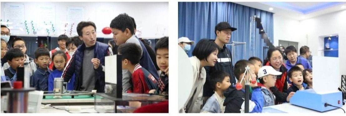 活动中,亲子家庭参观了数学与物理教学部物理实验中心(洛阳市科普教育基地)。实验中心的老师们通过演示设备以及引导讲解,采用模拟演示、亲身体验、互动参与等方式,将众多抽象的自然科学知识生动形象地展示出来,激发孩子们学习兴趣,引导大家对科学进行自主探究。