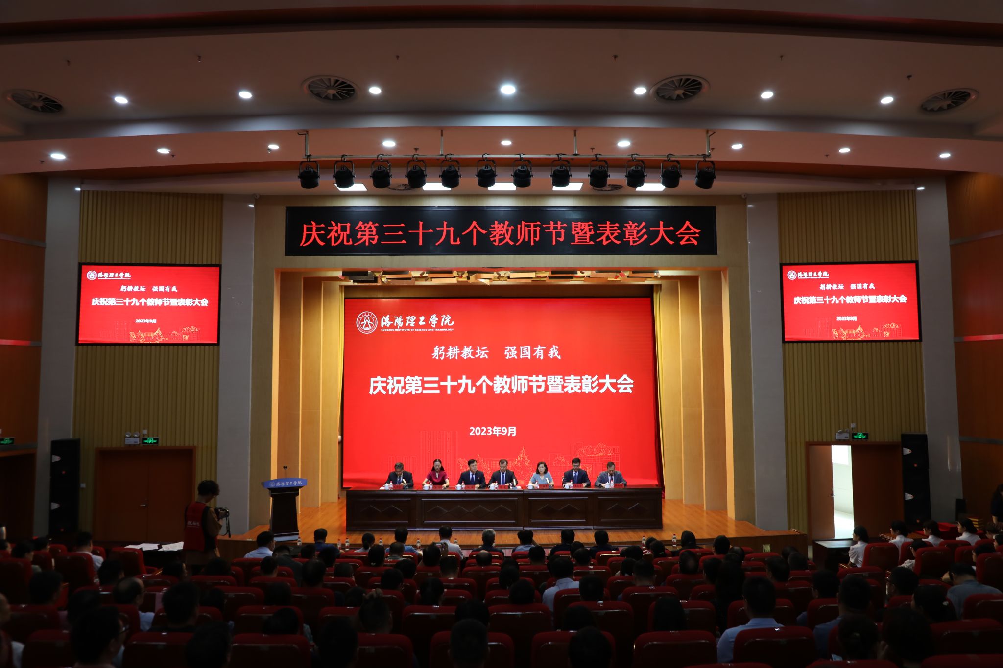 在王城校区图书信息中心报告厅,召开教师节表彰大会,庆祝第39个教师节。校领导陈岩、丁梧秀、刘楠、黄志全、马珺、韩洪涛、王新武出席会议、副处级以上干部、受表彰先进集体和个人、教师代表、学生代表参加会议。副校长丁梧秀主持会议。