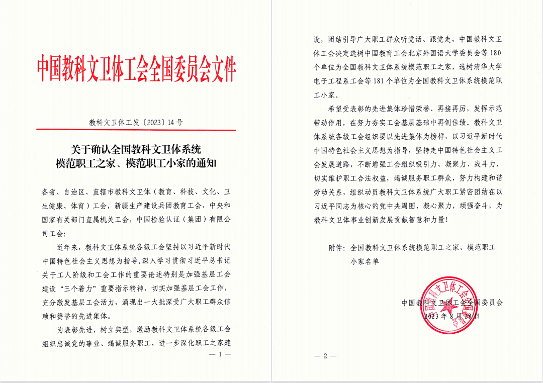 近日,中国教科文卫体工会全国委员会印发了《关于确认全国教科文卫体系统模范职工之家、模范职工小家的通知》(教科文卫体工发〔2023〕14号),美高梅娱乐场