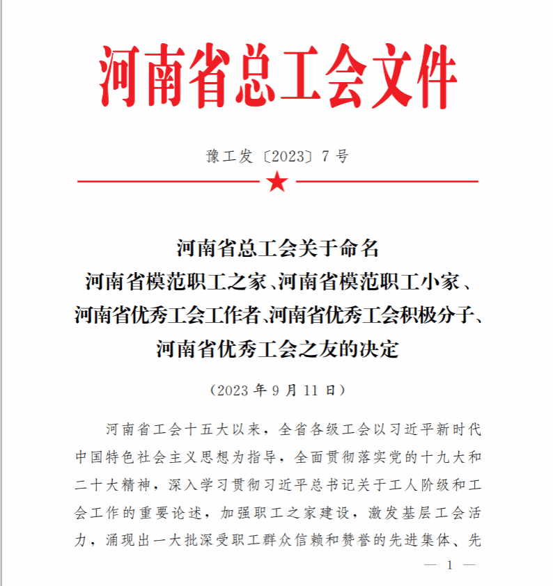 日前,河南省总工会下发豫工发[2023]7号《河南省总工会关于命名河南省模范职工之家、河南省模范职工小家、河南省优秀工会工作者、河南省优秀工会积极分子、河南省优秀工会之友的决定》,美高梅娱乐场