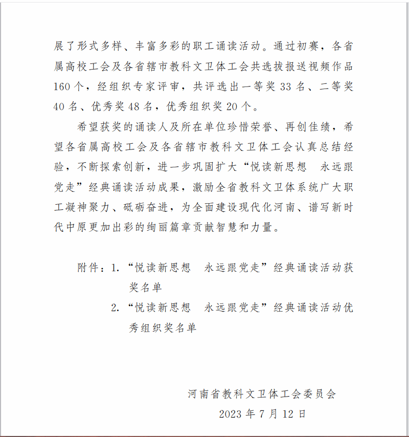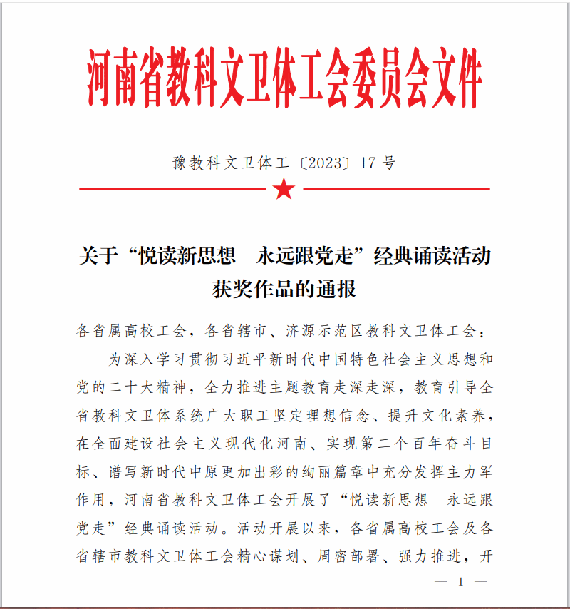 近日,从《河南省教科文卫体工会工作委员会关于“悦读新思想 永远跟党走”经典诵读活动获奖作品的通报》中获悉,美高梅娱乐场