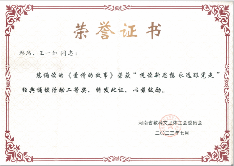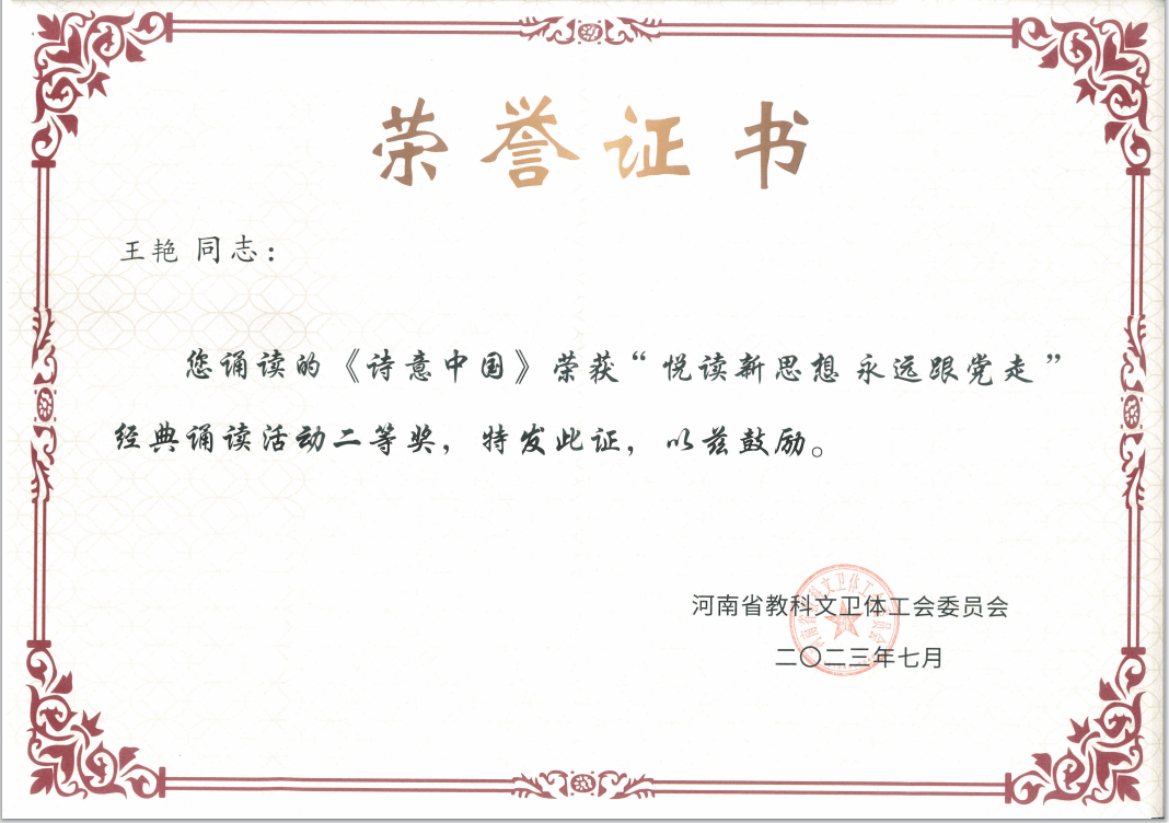 教师王艳老师诵读作品《诗意中国》和韩玮、王一如老师诵读作品《爱情的故事》均荣获本次经典诵读活动二等奖。