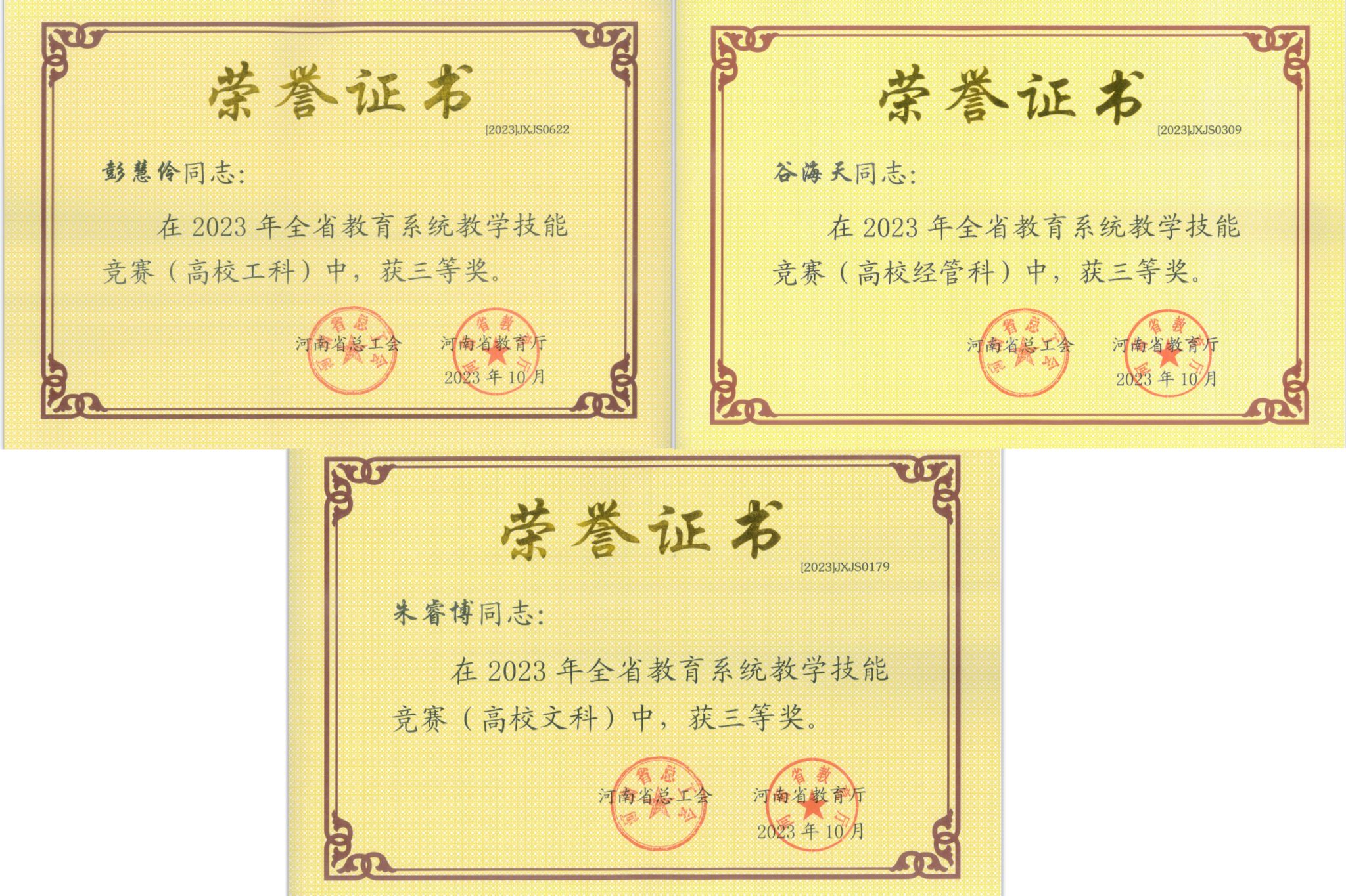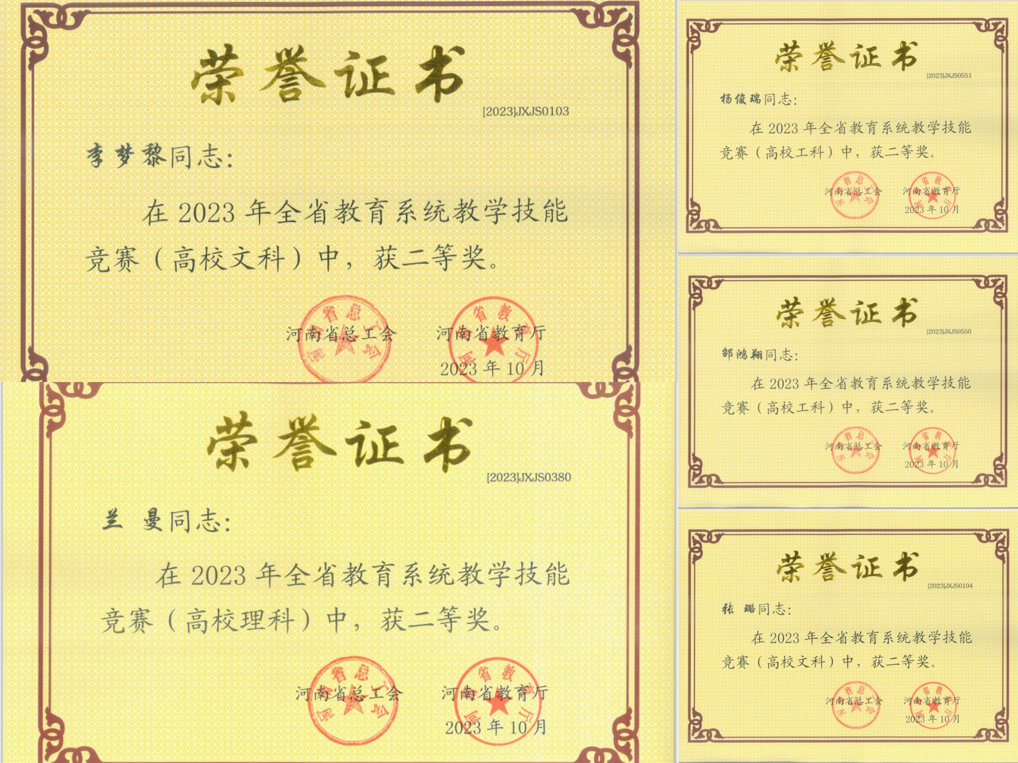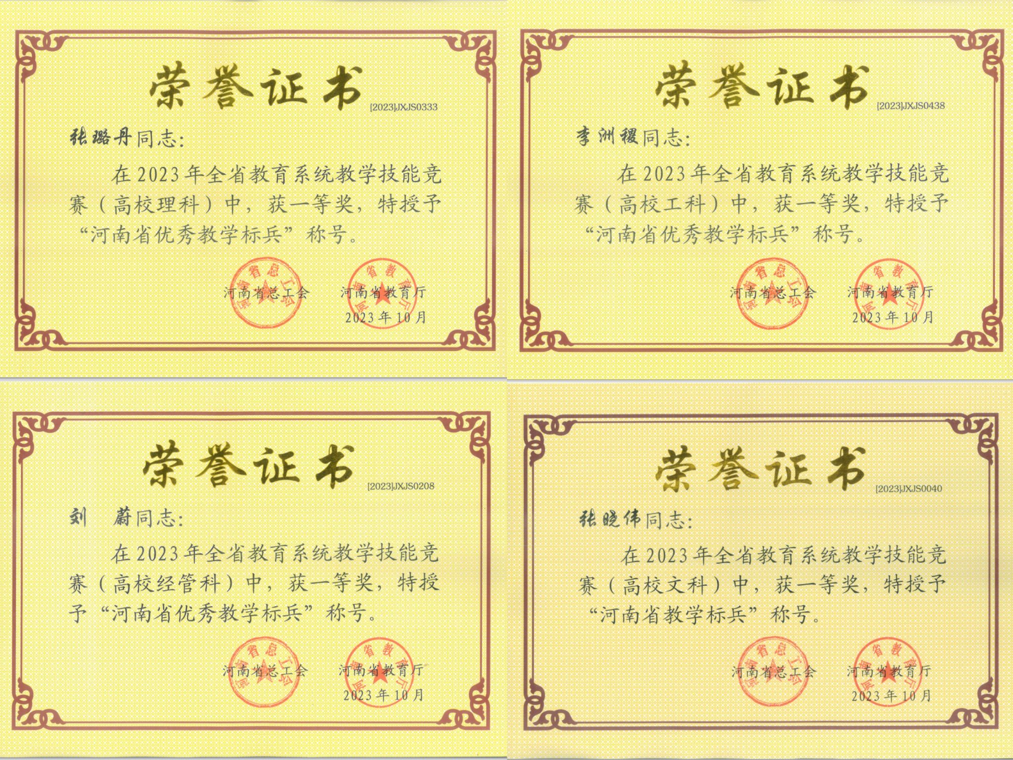 共12名教师获奖,李洲稷、张璐丹、刘蔚、张晓伟等4名教师获得一等奖,邵鸿翔、杨俊瑞、李梦黎、张璐、兰曼等5名教师获得二等奖,彭慧伶、朱睿博、谷海天等3名教师获得三等奖。其中,李洲稷、张璐丹、刘蔚三名老师参加现场决赛进入所在学科组前五名被授予“河南省优秀教学标兵”荣誉称号,张晓伟老师被授予“河南省教学标兵”荣誉称号。美高梅娱乐场
