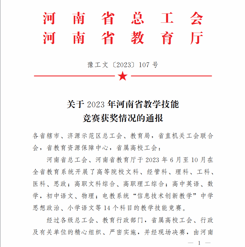 近日,河南省总工会、河南省教育厅联合下发了《关于表彰2023年河南省教学技能竞赛获奖情况的通报》(豫工文 〔2023〕107号),表彰2023年度全省教育系统教学技能竞赛中获奖的单位及个人。美高梅娱乐场