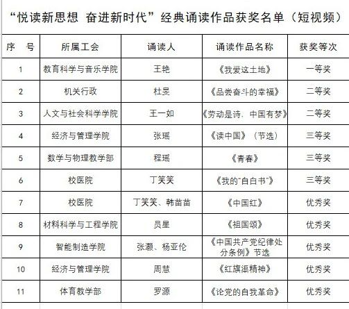 根据河南省教科文卫体工会《关于开展“悦读新思想 奋进新时代”经典诵读活动的通知》要求,美高梅娱乐场 工会于4月19日—5月8日在全校开展以“悦读新思想 奋进新时代”为主题的经典诵读大赛。经各基层工会预赛、美高梅娱乐场 决赛、专家评审,现将获奖情况公布如下:长视频一等奖2个、二等奖4个、三等奖6个和优秀奖6个;短视频一等奖1个、二等奖2个、三等奖3个和优秀奖5个。