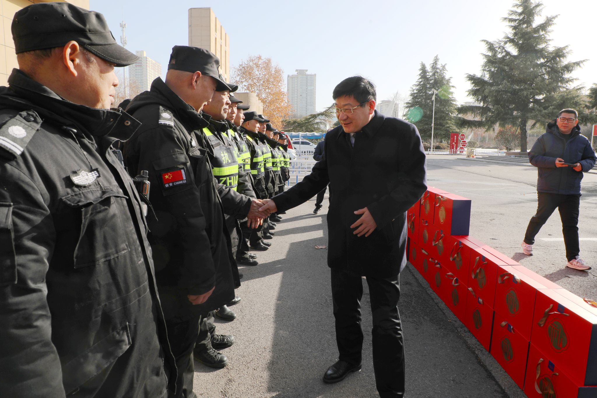 党委书记卢志文和春节期间坚守一线岗位教职工亲切握手交谈