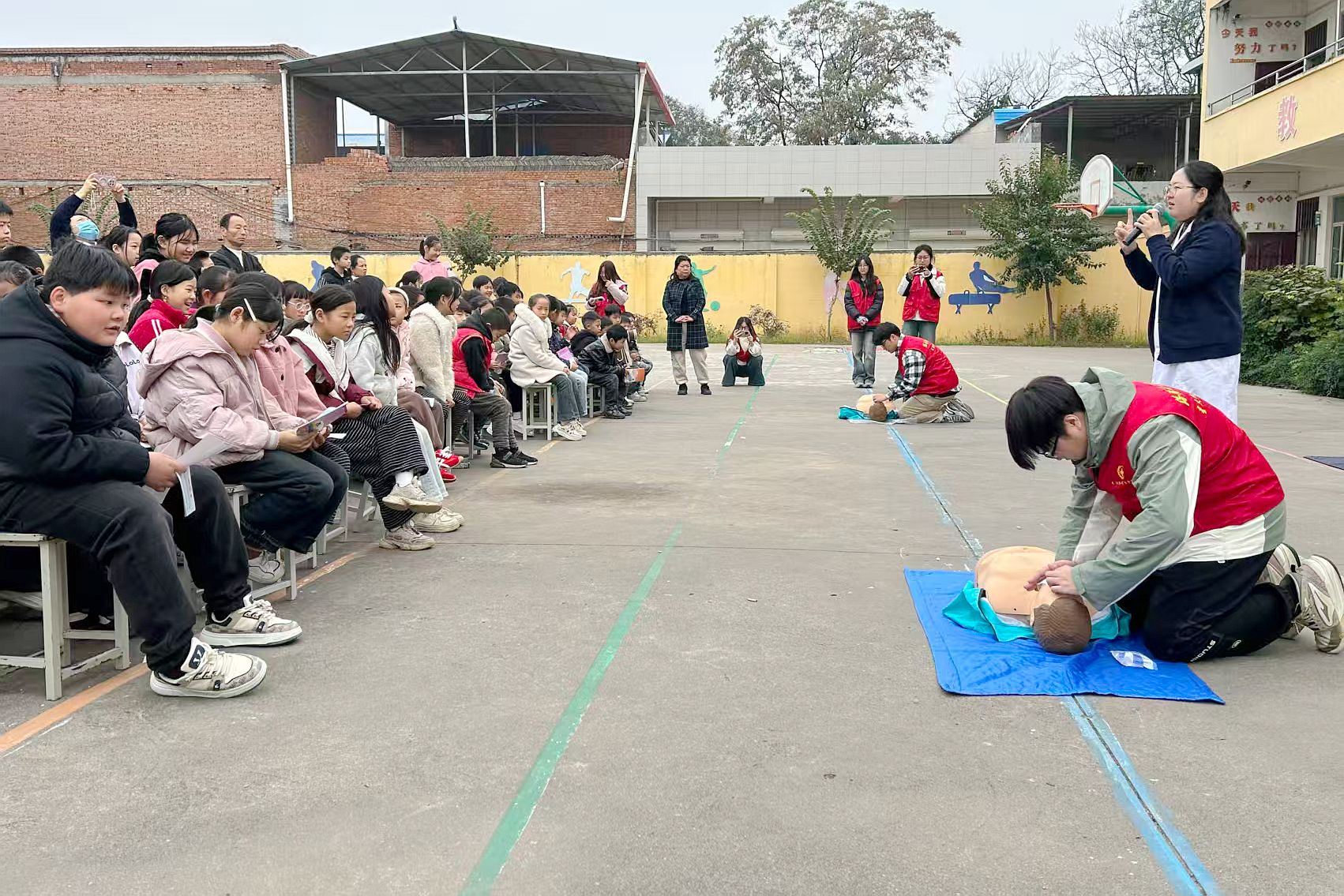 义诊团队还走进石垛小学,开展了海姆立克、心肺复苏等急救培训和演练,为小学师生上了一堂生动的生命健康教育课。