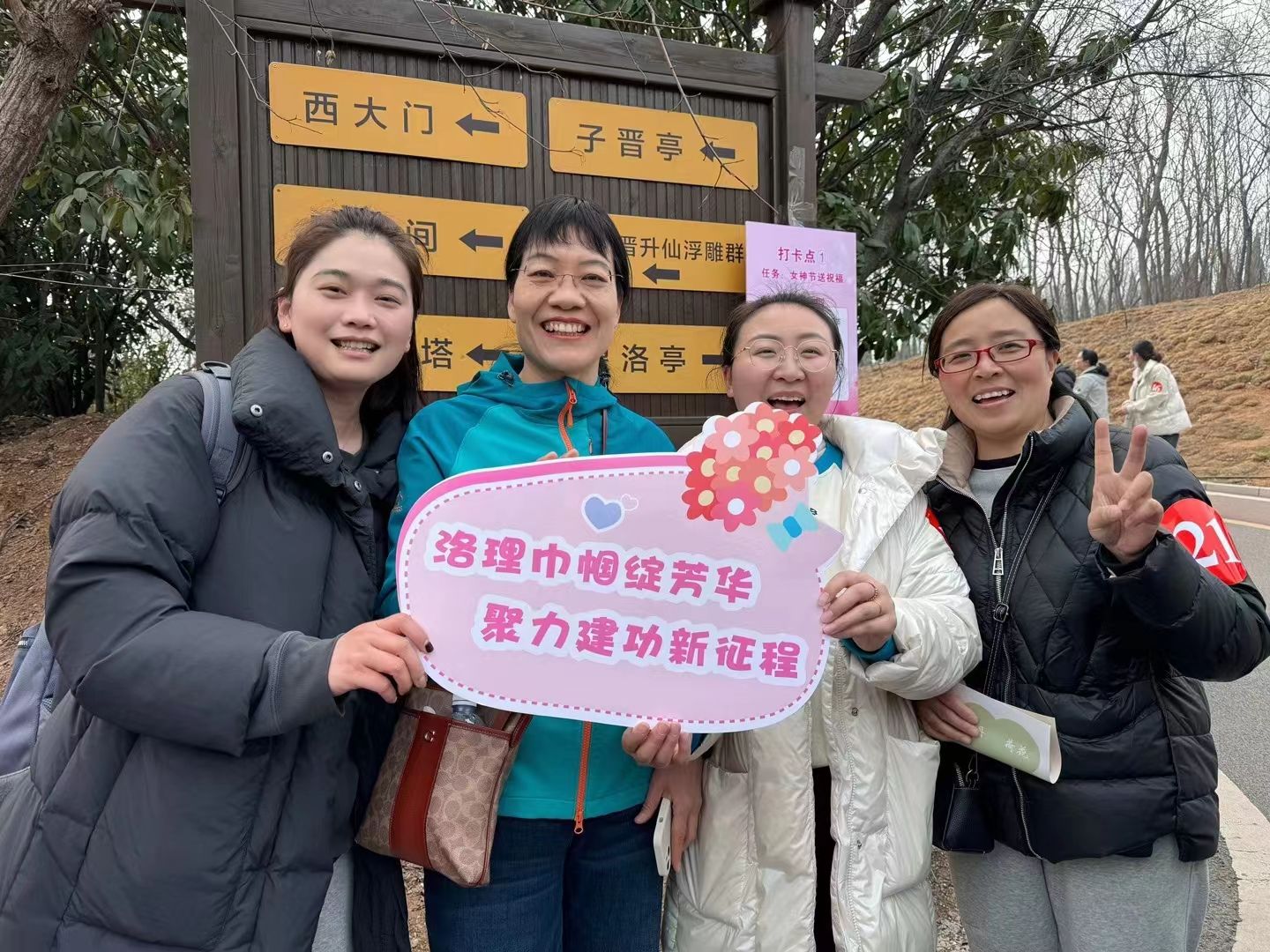 春光妩媚弥望眼。从周山公园南门出发,女教职工们沿着既定路线,一路欢声笑语,相互鼓励,边登山边欣赏周山风景,每个人脸上都洋溢着快乐的笑容,轻松愉悦的气氛与宜人的春色融为一体。活动以团队形式进行,沿途共设置“女神节送祝福”“编花篮”“知识问答”“团队展示”四个打卡点,团队成员齐心协力、密切配合,顺利完成打卡任务。过程中同事之谊、契合之精神,在登山毅行中不知不觉增强。