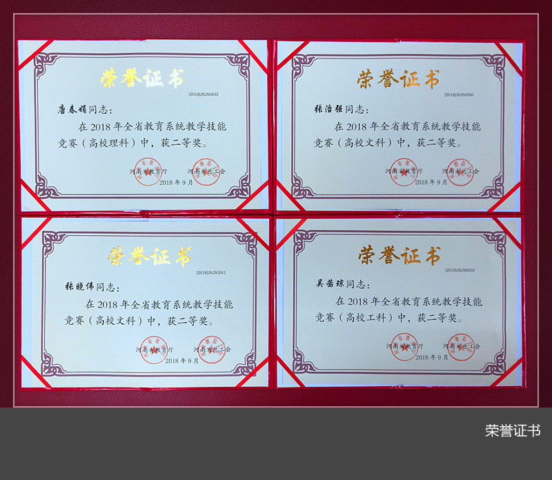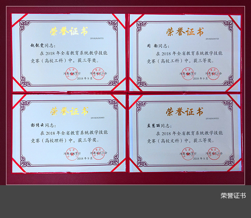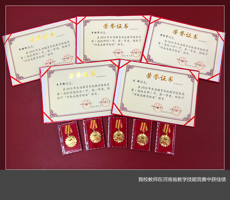 朱宇强老师荣获高校思想政治组一等奖;李振平和李继利老师荣获高校理科组一等奖,唐春娟和彭传云老师分别获得二、三等奖;黄会营老师荣获高校工科组一等奖,吴茜琼老师获二等奖,赵靓雯和闻韵老师获三等奖;闫玮老师荣获高校文科组一等奖,张治强和张晓伟老师获得二等奖,孟慧丽老师获得三等奖。本次教学技能竞赛对一等奖获得者授予“河南省教学标兵”荣誉称号并颁发奖章。