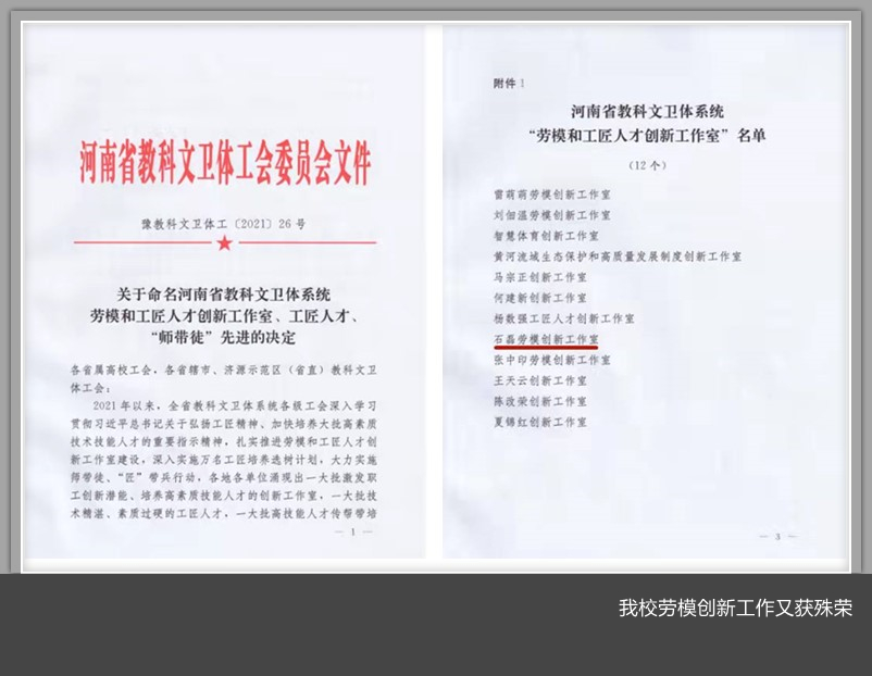 石磊劳模创新工作室被命名为河南省教科文卫体系统劳模和工匠人才创新工作室,这是美高梅娱乐场