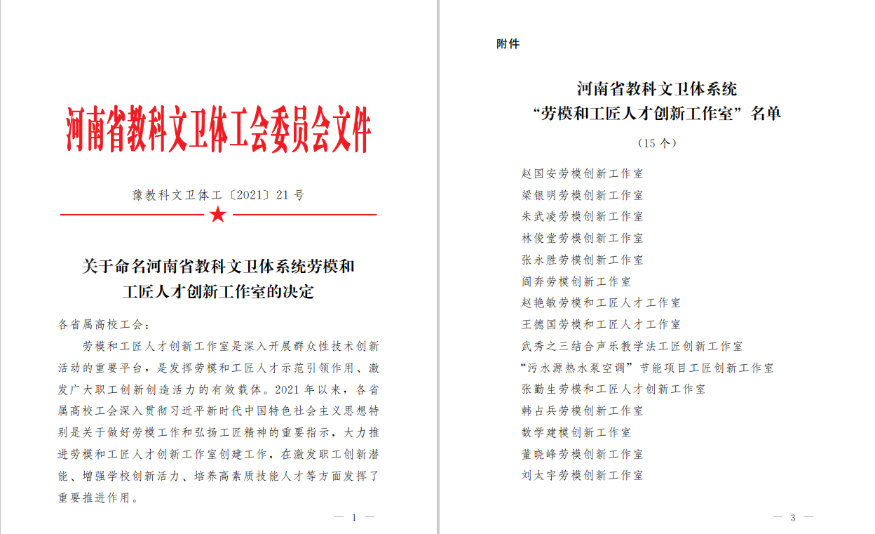 近日,河南省教科文卫体工会下发《关于命名河南省教科文卫体系统劳模和工匠人才创新工作室的决定》(豫教科文卫体工〔2021〕21号)文件,美高梅娱乐场