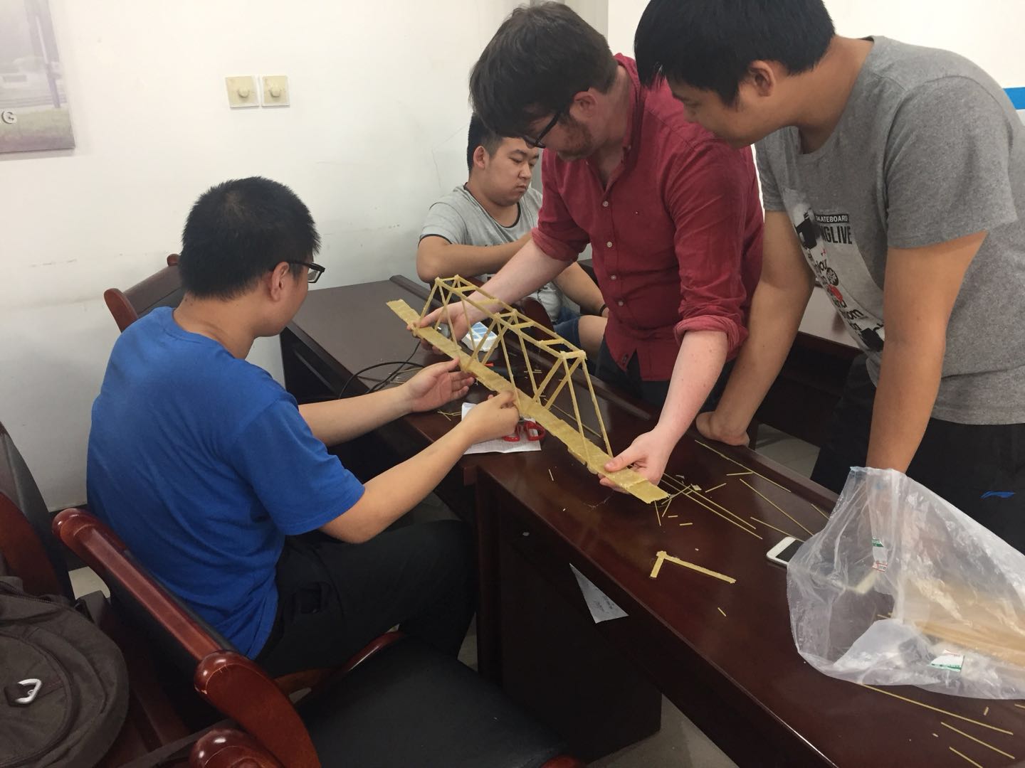 的外籍教师Sean博士多次交流与沟通后,决定引入爱方的“意面桥建造”比赛教学环节,此环节集趣味性与实用性于一体,可以让学生在动手实践中学习到材料的力学性质与结构设计,预测不同结构形式所能承担的荷载异同。