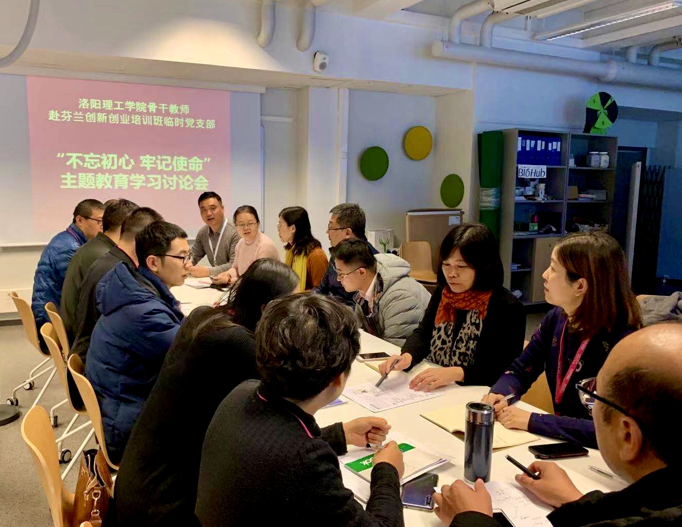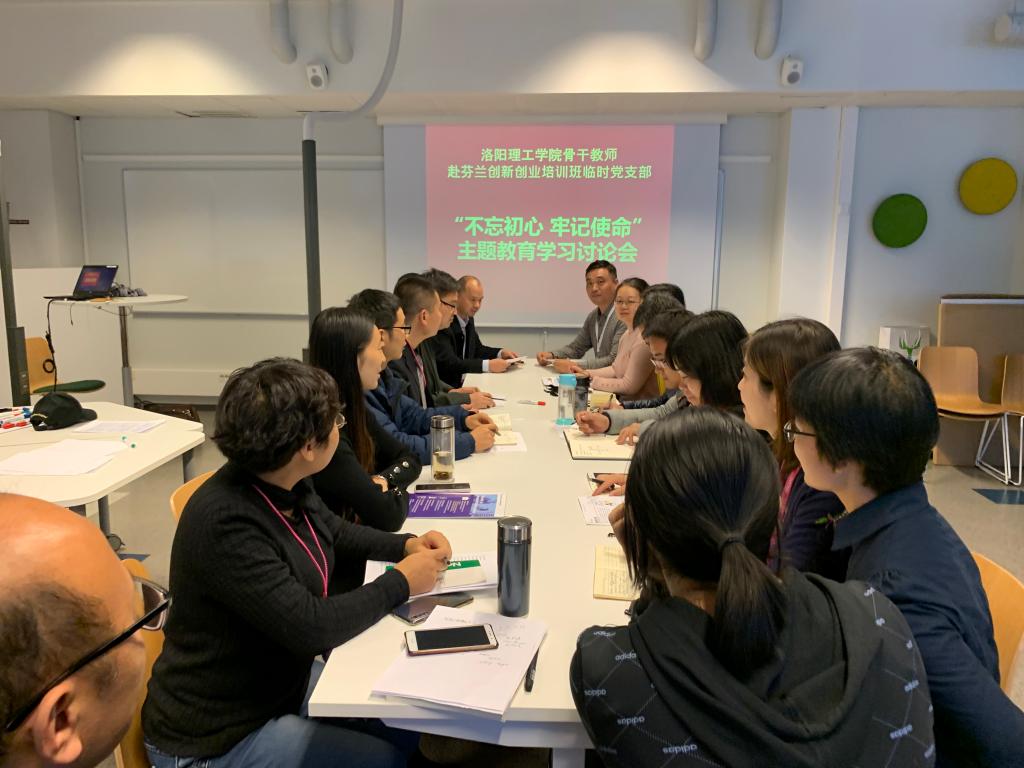 2019年10月22日当地时间下午四点,美高梅娱乐场 骨干教师赴芬兰创新创业培训班临时党支部在芬兰坦佩雷应用科学大学教学楼B2-19举行“不忘初心、牢记使命”主题学习交流讨论会,临时党支部书记雷海栋和副书记蒋建虎分别为大家解读了习近平新时代中国特色社会主义思想的精髓。之后大家展开热烈讨论,通过本次学习,提高了培训老师的政治理论素养,坚定了文化自信,增强了民族自豪感。