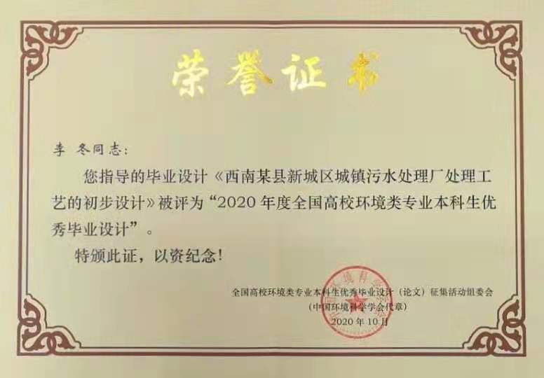 2020届环境工程专业本科生张帆凭借毕业设计“西南某县新城区城镇污水处理厂处理工艺的初步设计”荣获优秀奖。