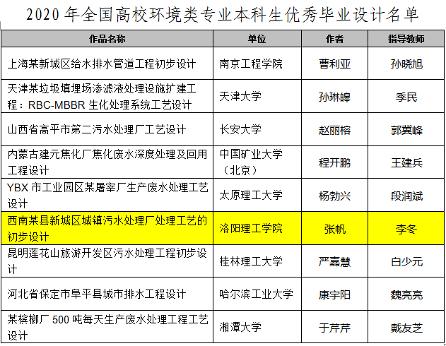 教师李冬担任指导教师,2020届毕业生张帆的毕业生设计作品《西南某县新城区城镇污水处理厂处理工艺的初步设计》成功入选并获得优秀称号。该荣誉的获得,是业界专家对美高梅娱乐场
