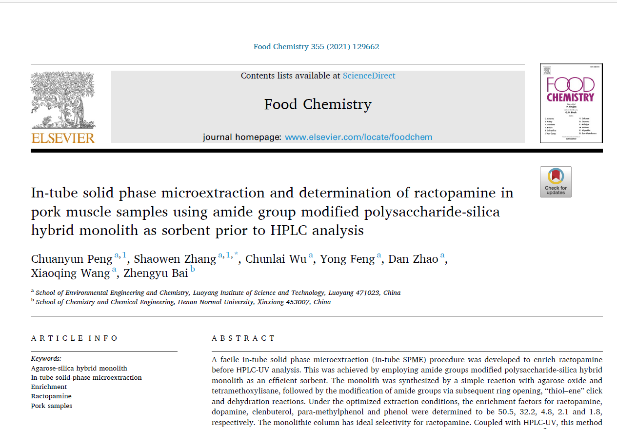 教师彭传云以第一作者在国际TOP专业学术期刊Food Chemistry上发表题为“In-tube solid phase microextraction and determination of ractopamine in pork muscle samples using amide group modified polysaccharide-silica hybrid monolith as sorbent prior to HPLC analysis”论文(Vol.355.2021. 9),该期刊为该专业领域TOP期刊(中科院1区,影响因子IF=6.306)。该研究以氧化琼脂糖和四甲氧基硅烷为前驱体,通过溶胶凝胶法制备有机硅胶整体柱,并进行酰胺化修饰,以此为固相微萃取介质对莱克多巴胺进行萃取富集实验。结合高效液相色谱-紫外(HPLC-UV),建立了肉样中痕量莱克多巴胺的分析方法。该方法具有检出限低、回收率高、样品用量少等特点,可实现不同肉样中痕量莱克多巴胺的检测。课题组教师依托美高梅娱乐场