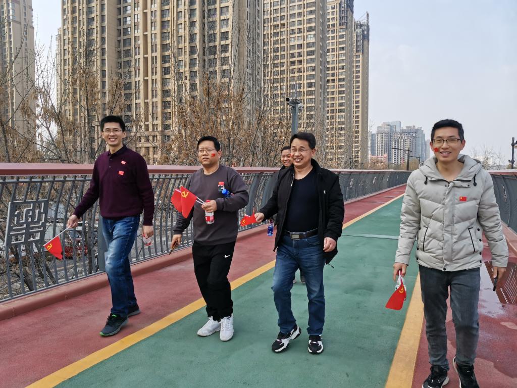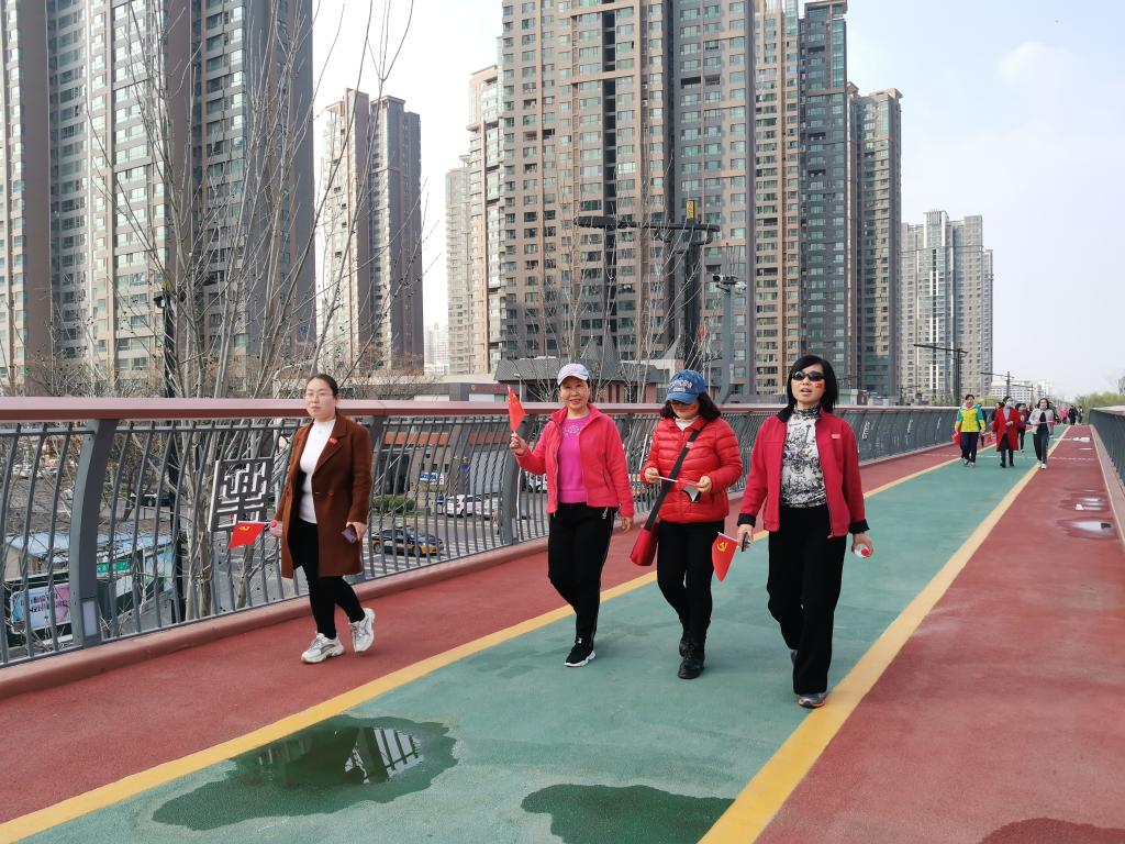 领导的“出发!”号令,全体教师手持小国旗和小党旗,迎着春风、踏着阳光,健走在彩色的步道上。