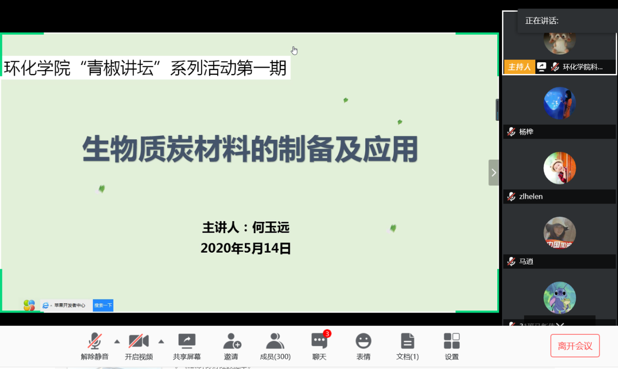 何玉远博士作题为“生物质炭材料的制备及应用”的报告。受疫情影响,讲座采用线上会议的形式进行,近300名学生参加了活动。