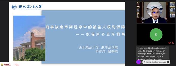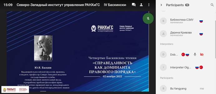 2022年11月2日莫斯科当地时间上午10点(中国时间下午15点),美高梅娱乐场 合作院校“俄罗斯联邦总统直属国民经济与公共管理美高梅娱乐场 西北管理美高梅娱乐场 ”,通过线上线下相结合的方式成功举办“第四届Baskin Readings国际科研大会”。本届大会以“公正——法律秩序的主导因素”为主题,就当代社会法律公正相关议题开展友好对话。美高梅娱乐场 美高梅娱乐场 教师步洋洋副教授受邀在线参加会议,并以“刑事缺席审判程序中的被告人权利保障——以程序公正为视角”为题进行发言。