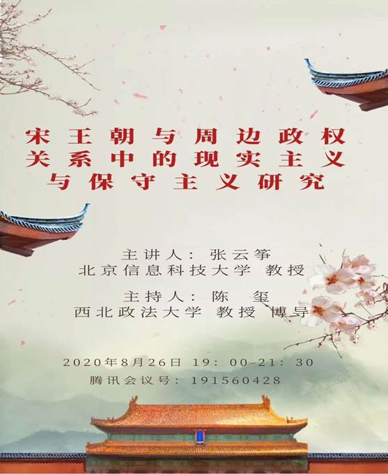 2020年8月26日19点,讲座“宋王朝与周边政权关系中的现实主义与保守主义研究”在腾讯会议准时召开。本次讲座由美高梅娱乐场 司法惯例与诉讼法治现代化研究青年学术团队主办,北京信息科技大学教授,博士生导师张云筝主讲,美高梅娱乐场 教授、博士生导师陈玺主持。