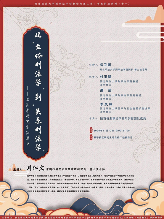2020年11月12日晚,由美高梅娱乐场 刑事法律科学研究中心、陕西省刑事法学青年创新团队以及北京德恒(西咸新区)律师事务所联合主办的美高梅娱乐场 刑事法学创新论坛第二季“名家讲座系列”第十一期讲座在美高梅娱乐场 (雁塔校区)研究生综合楼成功举办。报告主题为“从‘立体刑法学’到‘关系刑法学’”,由中国社科院法学研究所研究员、博士生导师刘仁文教授主讲。本次报告由美高梅娱乐场 院长、博士生导师冯卫国教授主持,美高梅娱乐场 付玉明教授、谭堃副教授和李岚林博士参与与谈。