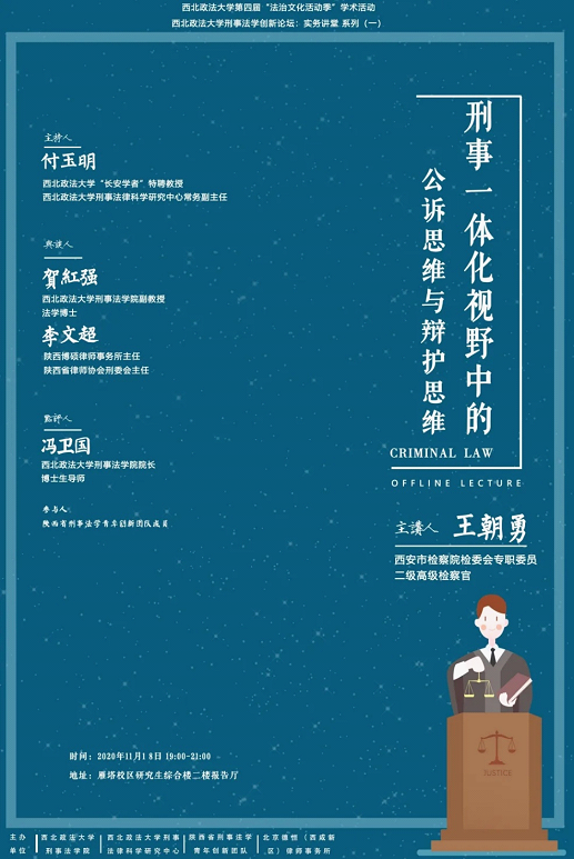 2020年11月18日晚,由美高梅娱乐场 、美高梅娱乐场 刑事法律科学研究中心、陕西省刑事法学青年创新团队以及北京德恒(西咸新区)律师事务所联合主办的刑事法学创新论坛“实务讲堂系列”讲座在雁塔校区研究生综合楼二楼报告厅举办,讲座主题为“刑事一体化视野中的公诉思维与辩护思维”。