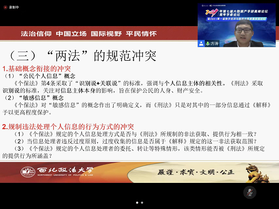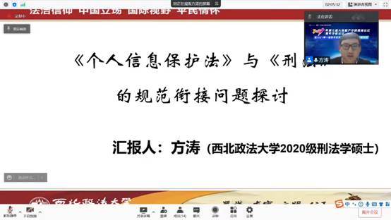 在青年论坛分论坛三——数字金融与数字治理,方涛同学作了题为“《个人信息保护法》与《刑法》的规范衔接问题探讨”的主题发言。