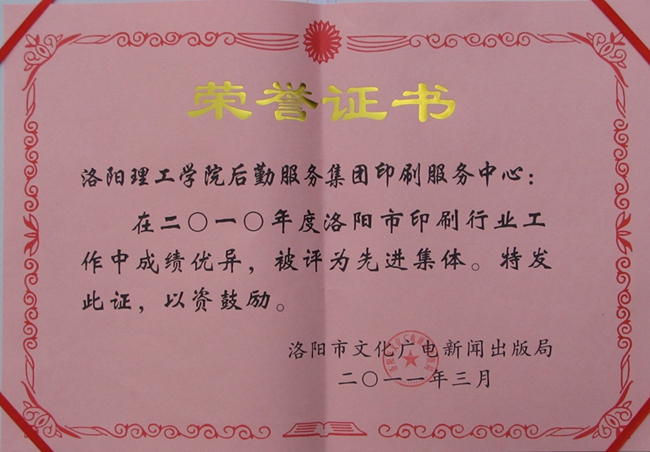2010年度洛阳市印刷行业工作先进集体(2011.3)