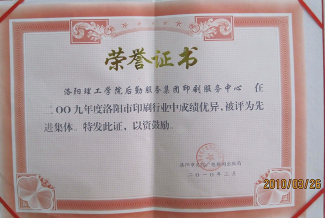 2009年度洛阳市印刷行业先进集体(2010.3)