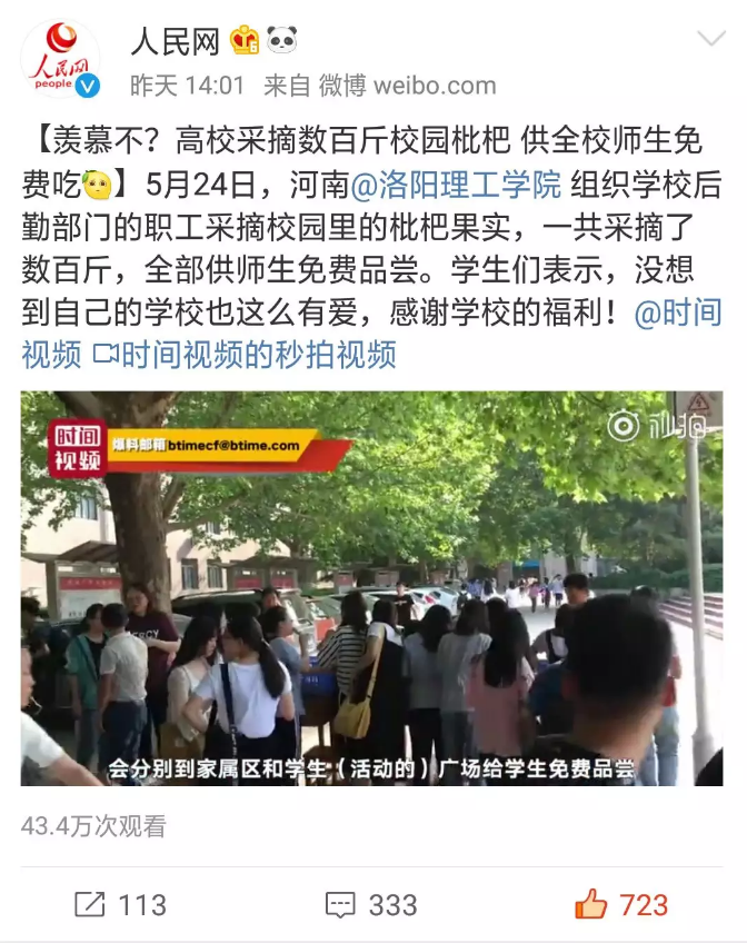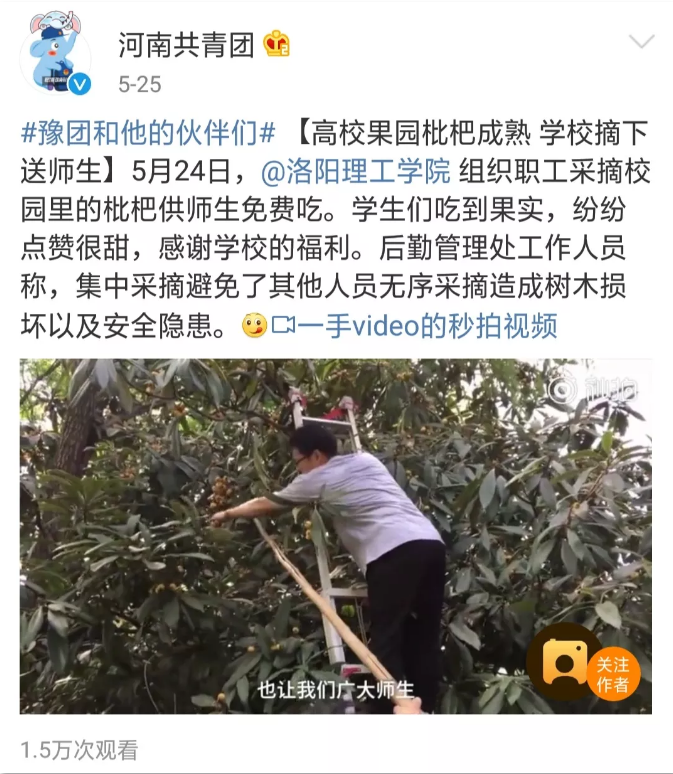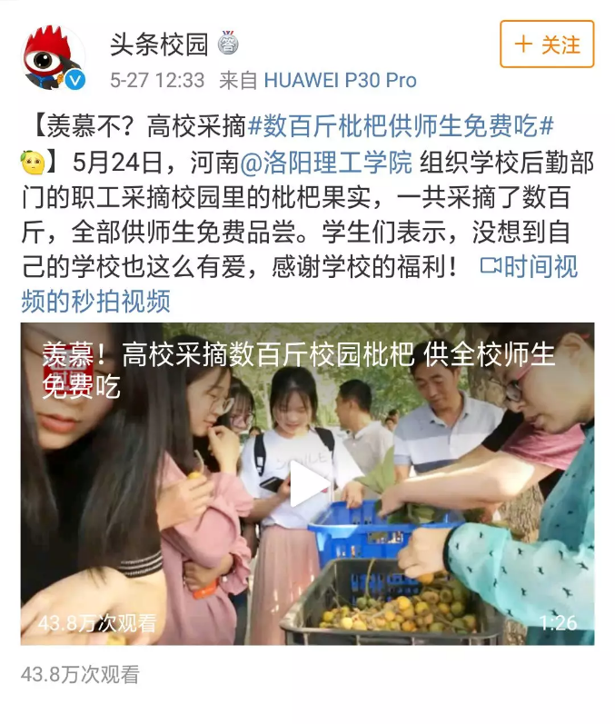 连日来,我处组织职工集中采摘校园成熟枇杷果实,免费供师生品尝暖心举措,持续被省内和国内广大媒体报道,人民网、中国日报、河南共青团等主流媒体先后转载,受到各界广泛赞誉。