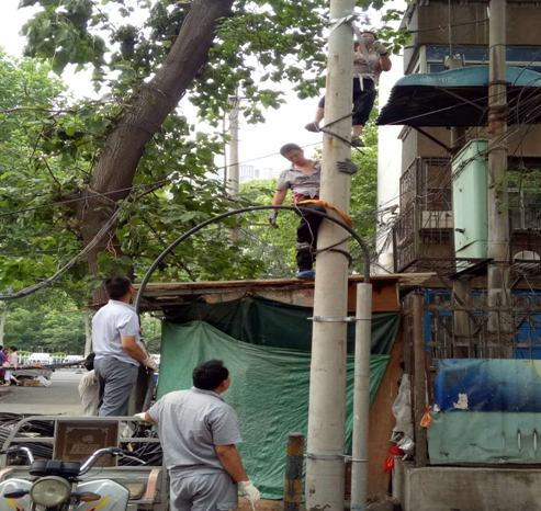6月20号的一场大雨,给酷热的城市带来了久违的凉爽,却也给动力的师傅们带来了不小的麻烦,珠江路家属区内一根十二米长的水泥线杆被一棵直径近一米的大树齐根轧断,当时正在下着大雨,线杆上的电线还带着电,珠江路家属区7-7、7-11两栋楼地理位置复杂,人流量非常大,围观人员聚集好几层,存在极大的安全隐患,情况火急。我们果断将两栋楼的电源切断,迅速与维修科沟通,安排重新栽埋线杆。经与办事处、110、林业局不断的协调,晚十二时,压着线杆的树被移走。次日上午清理现场立线杆栽,前期准备工作紧锣密鼓进行。