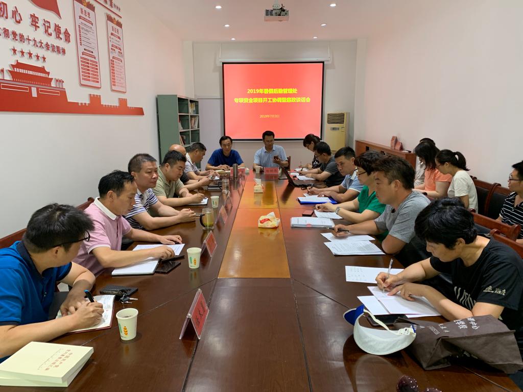 7月3日上午,后勤管理处2019年专项资金项目开工协调暨廉政谈话会在处一楼会议室召开。后勤副处级以上干部,维修科、监督科负责人以及施工单位、监理公司相关人员参加会议。会议由副处长薛占朝主持。