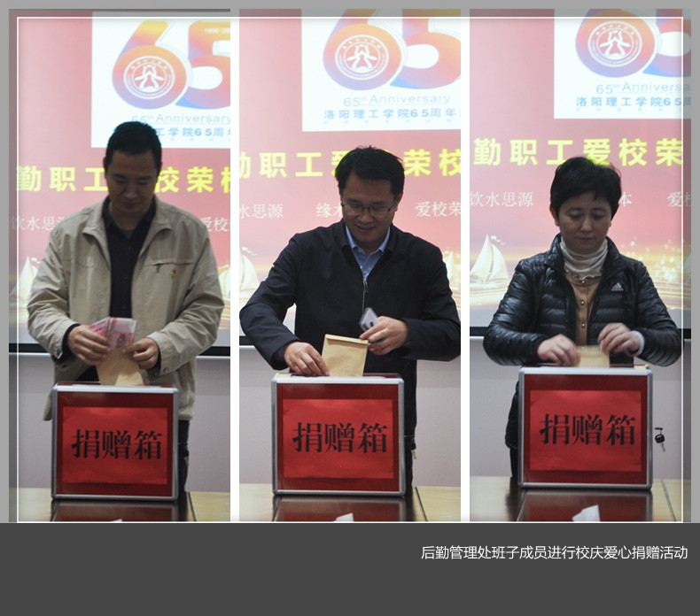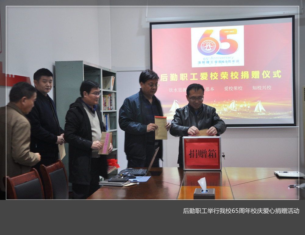10月29日上午,后勤管理处职工在会议室举行65周年校庆爱心捐赠活动。后勤管理处班子成员、各科室(部门)负责人及职工代表参加捐赠仪式。