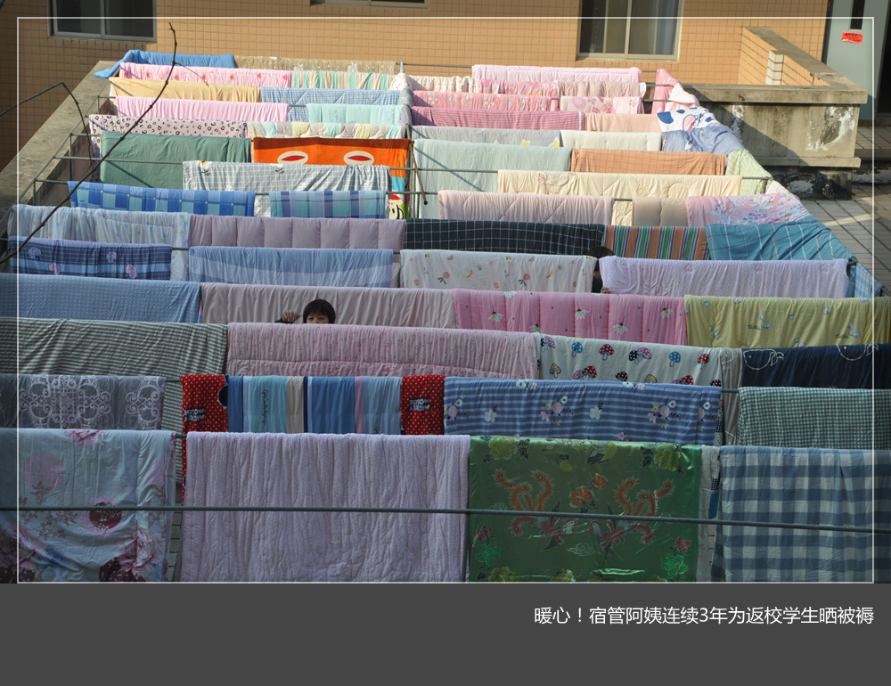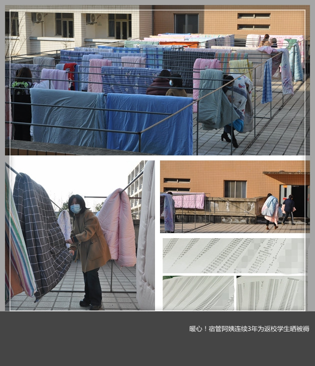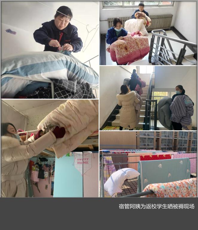 自2月24日起,洛阳的天气晴空万里,物业服务中心的宿管阿姨们又开始行动了,她们忙碌着把学生的被褥从宿舍搬运出来,集中晾晒在公寓连廊平台、楼下空旷地带……宿管阿姨忙碌的身影,成为校园一道靓丽的风景线。