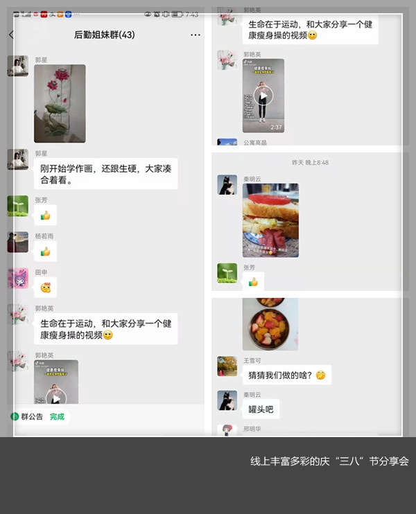 为展示后勤女职工自尊、自信、自立、自强的精神风貌,在庆祝第112个“三八”国际劳动妇女节之际,后勤分工会组织女工开展了丰富多彩的系列文体活动。在“心灵手巧,炫我才艺”活动中,后勤女工贴近生活实际、利用短视频形式,展示才艺。在“展巾帼风采,享美好生活”趣味定向活动中,四人一组按照规定次序依次打卡,协作完成关注“洛理亲”公众号、“心愿墙”、“纸飞机”、“团队展示”等任务,享受着运动带来的快乐。“后勤姐妹分享会”大家相聚云端,通过视频、音频、文字、图片等形式畅所欲言,交流工作经验,介绍缓解身心压力方法,展示业余爱好,传授教育子女心得体会,分享居家生活小窍门、穿衣搭配的知识,讲解摄影技巧等。