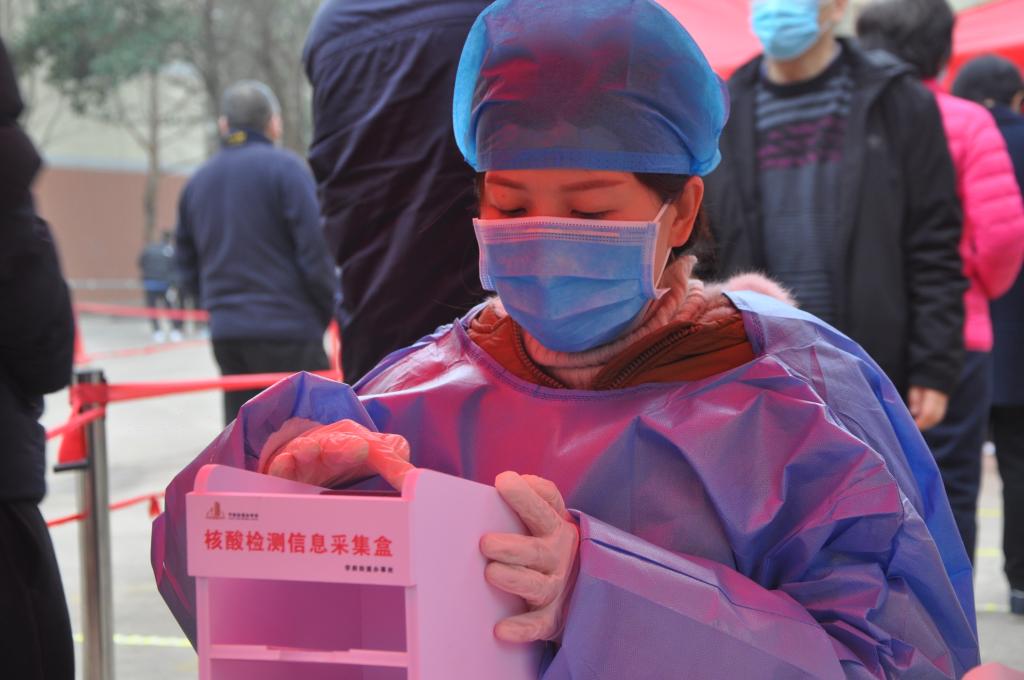 在现场,有的协助医护人员登记、录入检测人员的身份信息,有的组织职工进行扫码,有的时刻叮嘱着大家保持好1米以上的安全距离,提醒大家在检测的过程中带好口罩、做好个人防护……
