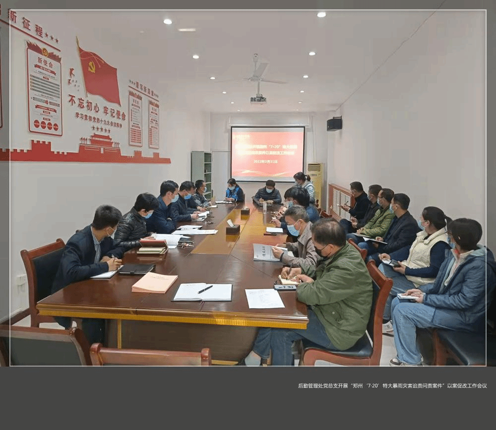 3月31日下午,党总支书记丁国强主持召开后勤管理处“郑州‘7·20’特大暴雨灾害追责问责案件”以案促改工作会议,后勤领导班子成员、各党支部书记、各科室、中心负责人参加会议。