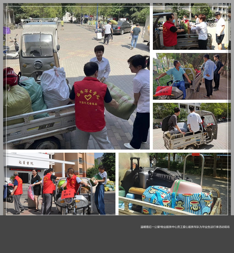 又是一年毕业季,连日来,物业服务中心员工在自发组建爱心服务车队为毕业生送行李,成为校园一道亮丽的风景线。他们身着红马甲或在校园道路上穿梭,或忙碌着为毕业生搬运物品,这些瞬间都让人很是感动。6月伊始,洛阳正值高温天气,员工们一车车,一趟趟,个个累的满头大汗,有的一天都跑一二十趟。当把毕业生行李送到校门口家长接送点或者美高梅娱乐场 大巴候车点,学生们感激地不停说着:“谢谢叔叔,谢谢阿姨”时,内心虽苦犹甜;还有的学生坐上这些爱心服务车出发时,不停地向宿管阿姨挥手告别,热泪盈眶。宿管阿姨一边叮嘱回家路上要注意安全、一边嘱托他们以后有机会常回来看看。