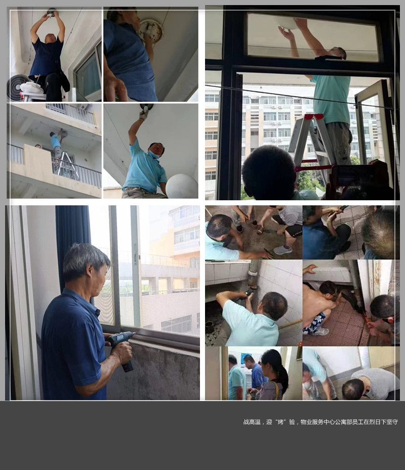 ——公寓管理部,家的守护者。学生一离校,公寓管理部的维修师傅和管理员们就忙碌起来。全校29栋楼宇,近5000个房间,以及走廊、阳台,他们需要逐楼逐层逐房间检查和维修水电设施,他们爬高上低,一丝不苟的在紧张作业,衣服湿透了就光着膀子干,因为他们知道,时间不能等,必须自我加压,学生返校后务必全部完成,确保住宿条件有效完善。