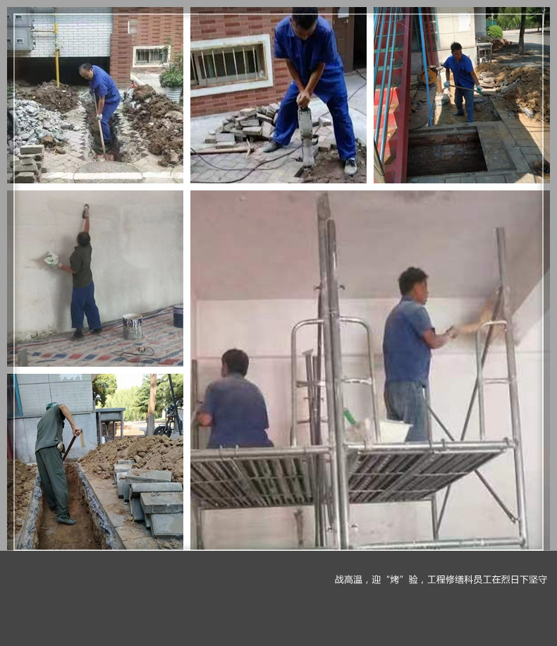 ——工程修缮科,校园建设的维护者。 工程修缮科有一支作风顽强的维修队伍,他们长年在室外作业,工作环境恶劣,从他们汗水浸泡后发白的工作服、饱经风霜的脸庞和充满老茧的双手,就能窥见一斑。每逢节假日,是他们工作量最大的时候,今年暑假维修任务非常繁重,他们总是早早到校,拆、挖、砌、抹、粉样样都得干,或高空,或井下哪里都得去,没有人叫苦,没有人退缩,更没有人在树下乘会凉,他们心里只有一个念头,抓紧干活,在开学前完成工程任务。