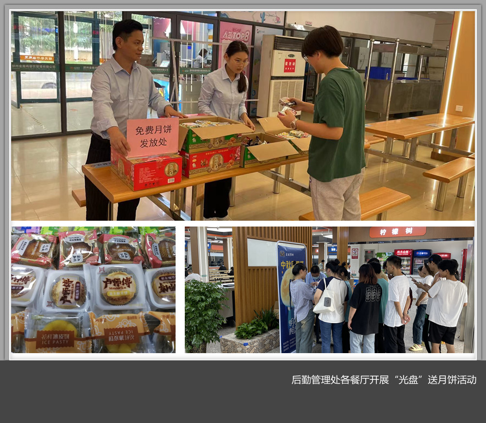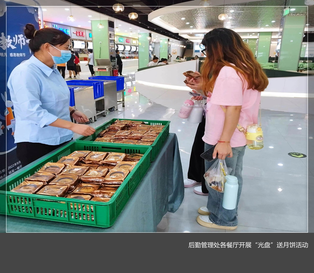 平分秋色一轮满,长伴云衢千里明。9月10日,既是教师节也是中秋节,为了让在校师生感受到浓郁的中秋佳节氛围,后勤管理处饮食服务中心各餐厅开展“光盘”送月饼活动,餐厅里洋溢着浓厚的中秋佳节节日气氛。